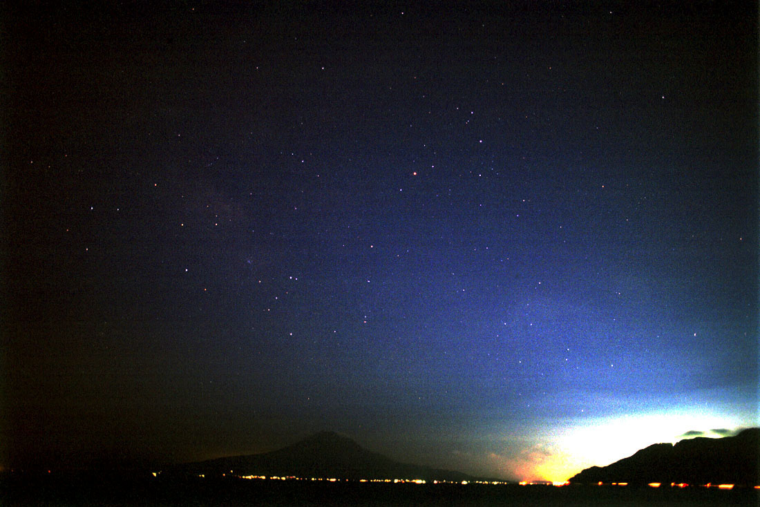 TOP ← いて座へ → さそり座 10/24-11/21生れ 夏の星座で有名です さそり座 画面下は、桜島と鹿児島市内の街明かりです。さそり座の小尾から頭部背中へ見ると、 赤い1等星アンタレスが見えます。また、さそり座の小尾上に、いて座がみえます。7月の半ばごろ、 南中高度(星座が真南の天中心高度に来た時)約30度の高さにS状の明るい星が連なって見えます。 TOP ← いて座へ →